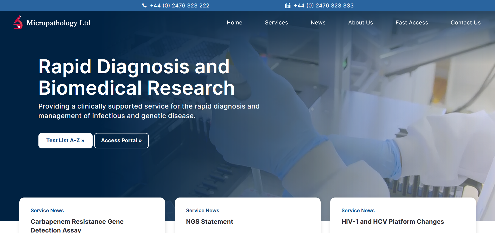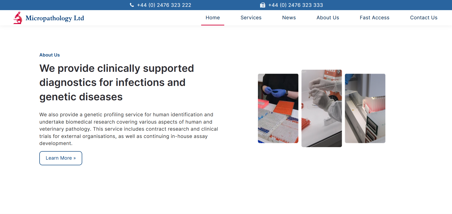 As an addition to the client portal, the solution was a modernised website in the same technology stack as their client portal. We built an API that interfaced with their LIMS Database and had the website make calls to the API to display the latest test information. Taking this further, we were able to integrate the PDF Downloads with their internal LIMS system, allowing certain users within their company to update documents available on the website without IT support. We also integrated their customer portal API with the registration form which enabled their customers to register for the portal through the website. This kept things familiar for Micropathology's customers as they were used to registering for price lists this way already.